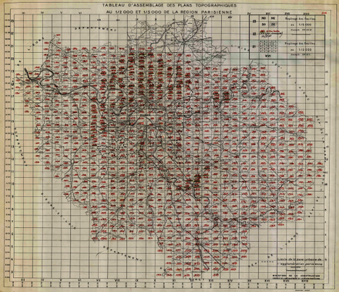 Voici le tableau d'assemblage des plans. Ceux dont l'année est postérieure à 1971 existent dans 2 versions, l'une de du début des années 1970 et l'autre de la fin des années 1970. . Attention au nivellement utilisé, avant ou après celui de 1969. Les plans au 1/2000 de Mennecy sont dans l'ancien nivellement. On le détermine en lisant les côtes des repères de nivellement et en les comparant aux côtes affichées dans les fiches de ces repères trouvées sur geoportail.